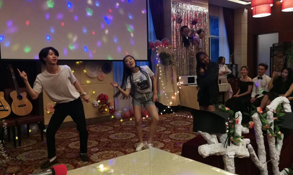 最后一个表演是由即将毕业的小哥哥和小姐姐们亲自演奏《因为爱情》,并配上双人的《华尔兹舞》,舞姿浪漫动人,打动了在场的每一位师生。