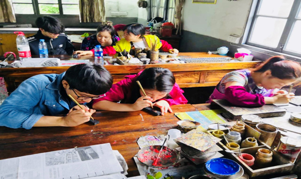第四天早上,我们来到了此行的最后一站——安徽老字号的胡开文墨厂,这也是本次旅行的重头戏。胡开文墨厂已有是一个百年老店。设有雕模、点烟、制墨、晾墨、打磨、描金等十多个生产工序和一个设备齐全的墨锭理化检测中心。集中了名家制作徽墨的全部技术设备和祖传配方,拥有明清以来历代名家创作雕刻的珍贵墨模七千八百品种,至今保留传统工艺精华——古法手工点烟技术。我们一行人先是观看胡开文墨厂的纪录片,主要介绍了它的历史沿革,其次跟随着专家去每一间厂房,参观徽墨的制作工序,讲解员每到一间厂房都会详细跟我们介绍。在观摩过程中,同学们对徽墨产生了浓厚的兴趣,在专家介绍结束后,我们很有幸的亲身体验了徽墨制作过程中的其中一道工序——描金。同学们两两一组跟着一位师傅学习,“最初听师傅讲解的时候,觉得描金很简单,但是轮到自己上手去描的时候才发现并不是如此”,我们一位学生描完后如是说。同学们亲身体验完描金之后,更加懂得了徽墨制作过程的繁琐复杂,同时也感叹这些师傅们的精湛高超的技艺。