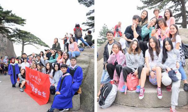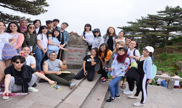 第二天早上,学生们在老师的带领下前往黄山脚下。黄山是世界文化遗产,也是中华十大名山,俗成“天下第一奇山”,具有“五岳归来不看山,黄山归来不看岳”之美称。黄山迎客松更是享誉世界,也是整个黄山的象征,它恰似一位好客的主人,挥展双臂,热情欢迎海内外宾客来游览。导游告诉我们上至庄严的人民大会堂,下至车站码头、宾馆庭院随处可见它的身影。迎客松已然成为中国与世界人民和平友谊的象征。登山的路并不好走,但是同学们互相搀扶,有说有笑,爬山的辛苦并没有阻挡他们对中国文化的好奇和探索,道路两旁的各类植物,台阶上的挑山工,他们总想弄个明白。终于历经近四个小时的攀爬,我们终于到达了黄山光明顶并合影留念。