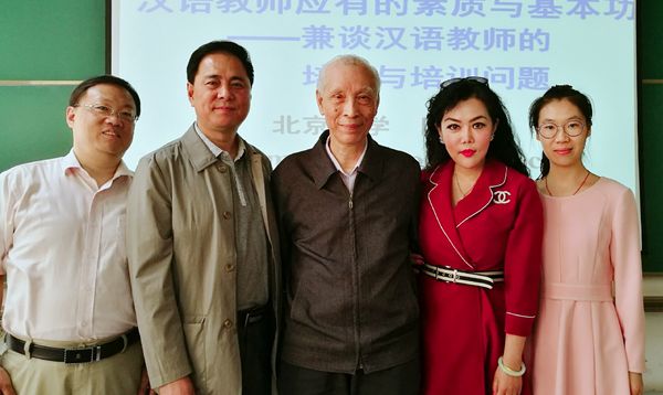 83岁高龄的学术泰斗陆俭明教授才思敏捷、出口成章。他首先提出:如果说从前的对外汉语教学是以国内作为视角和出发点,那末今天的国际汉语教学就是以全世界作为视野和着力点。在“汉语热”的全球大背景下,国际汉语教师的培养和应该具备的素质已经成为我们学界研究的重点问题。首先我们要明确汉语教学的学科性质--它是以汉语言文字教学为核心、为基础,同时又涉及到多个学科的相互交叉,相互渗透,相互影响,因此,我们在课堂教学中尤其要明确语言教学和文化教学之间相辅相成的关系。陆先生在讲座中明确地向同学们介绍了汉语课堂教学中最直接的目的就是让外国留学生学习和掌握好汉语,并能把书本上的语言知识迅速内化,能够在真实的交际场合自由、得体、熟练地使用汉语与中国人进行交际。汉语教学应该具备的指导思想就是要以学生为中心,以需求为导向,锻炼学生使用汉语思维的能力。陆先生以自己从事汉语教学六十载的教学经历提出:在“双一流”高校建设的背景下,国际汉语教学事业更应该配合国家的“中国文化走出去”的战略,积极规划汉语国际教育学科的可持续性发展策略。“三教”问题中,汉语教师综合素质的培养是核心问题,在讲好中国故事的时代大背景下,每一个汉语教师都应该具有把握时代脉搏,捕捉国别特色;教学需求出发,放眼全球视野;研究典型个案,升华普遍规律的综合素质。