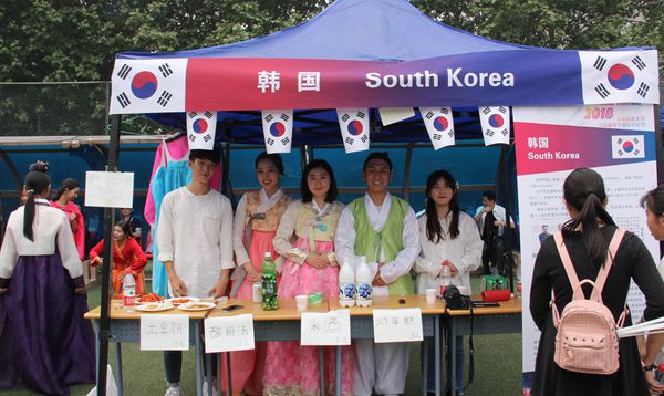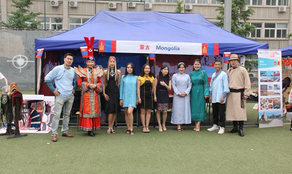 在各国文化展示区,蒙古、越南、美国、日本、印度尼西亚、刚果布、吉尔吉斯斯坦、缅甸、韩国、哈萨克斯坦、土耳其、突尼斯、塔吉克斯坦、泰国、柬埔寨、乌兹别克斯坦和法国十七个国家的学生设置了各自国家的展台。他们身着本国传统服饰,不断向众多参观者进行着讲解和互动。学生们精心准备了文字介绍、特色美食和精美手工艺品小礼物,向前来参观的师生展示着自己国家和民族的语言、风情和文化。蒙古学生带来了精致的马鞍和现场书法,柬埔寨同学准备了精巧的钥匙链,泰国同学设计了套圈赢特色饮品的游戏,日本学生手把手教你玩传统的剑球游戏,刚果布同学敲响了非洲鼓吹响了嘹亮的号角……各国学生亲手制作的美食最被热情的参观者追捧。今年首次推出的文化节护照不到一个小时也被一抢而光。