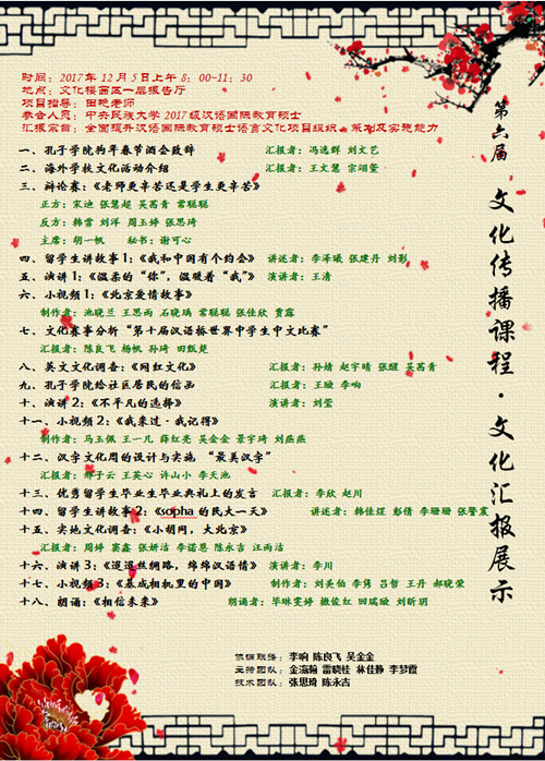 2017年12月5日上午,中央民族大学william威廉中文官网2017级汉语国际教育硕士专业“语言文化项目设计与实施汇报展示活动”在文化楼一楼报告厅举行,共有中外研究生80余人参加了这次活动,该活动获得圆满成功。这次“汇报与展示活动”共分为“文案写作类”、“活动策划类”、“语言表达类”、“视频故事类”、“赛事分析类”和“文化调查类”共六大类,总计18个汇报项目。该汇报展示活动由田艳副教授总体策划与指导,由汉教硕士亲自参与实践并进行汇报展示。该活动至今已成功举办6届。