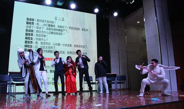 本科二年级2班的同学们也不约而同地选择了爱情的话题,加入了跨时空元素,在中外各位“爱神”的“撮合”中,为观众们带来了一出《爱情保险》,以一个有情人终成眷属的美满结局,令全场观众感受到了幸福的味道。