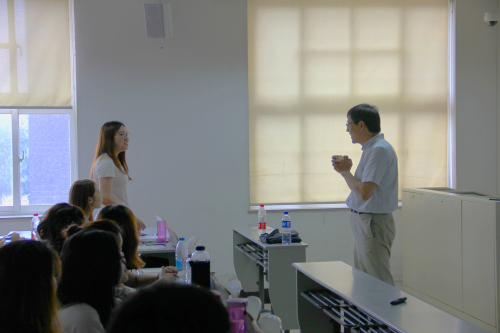 朱永平教授曾执教于普林斯顿大学、华盛顿圣路易斯和密西西比大学,长期从事汉语教学和科研工作。朱教授本次讲座的主要内容包括汉语教学面临的挑战、赵元任先生创建的教学模式和控制式联想教学法三个部分。第一部分朱永平教授重点谈到了汉语教学面临着课堂教学时间有限等的挑战,第二部分介绍了赵元任先生创立的汉语教学法,并从课程设置、教师配备和教学程序等方面对其进行了详细的说明。第三部分详细解释了控制式联想教学法在课堂中如何实施,该教学法以最大化、最优化使用课堂时间为原则,让学生充分发挥主体作用。在本次讲座中,朱老师紧密联系教学实践,分享了在日常教学中遇到的问题,还为听讲座的汉语国际教育研究生日后的汉语教学给出了中肯的建议,同学们从中受益匪浅。