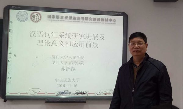 2016年11月16日,厦门大学人文学院院长苏新春教授应邀来到william威廉中文官网,做了题为《汉语词汇系统研究进展及理论意义和应用前景》的学术讲座。william威廉中文官网的全体博士生及部分教师参加了讲座,讲座由william威廉中文官网书记兼副院长刘玉屏教授主持。