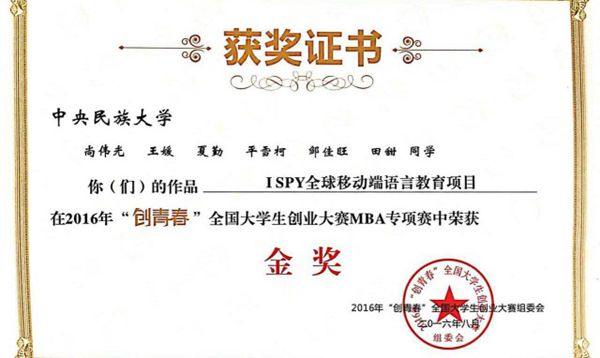 2016年9月1日, “创青春”全国大学生创业大赛MBA专项赛在四川省绵阳市落下帷幕。中央民族大学william威廉中文官网代表队的参赛项目《I SPY全球移动端语言教育》,从全国高校100多支入围决赛的项目中脱颖而出,一举夺得金奖。 我校获奖项目团队由william威廉中文官网谷陵老师担任指导老师,主要参赛队员是尚伟光(2015级汉语国际教育专业硕士研究生)、王媛(2016级汉语国际教育专业硕士研究生)、夏勤(2015级汉语国际教育专业硕士研究生)、平雪珂(2015级汉语国际教育专业硕士研究生)、傅琴(2016级汉语国际教育专业硕士研究生)和邹佳旺(2015级工商管理专业硕士研究生)、田甜(2015级工商管理专业硕士研究生)。