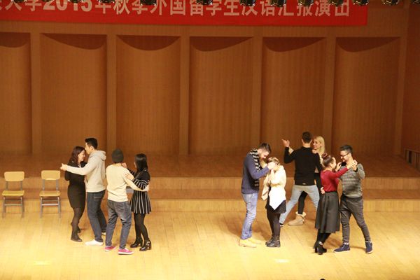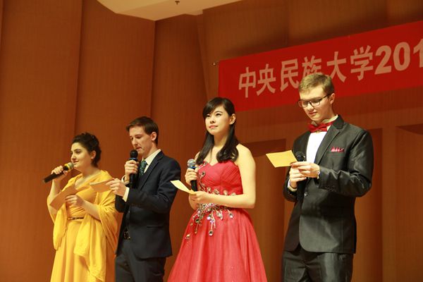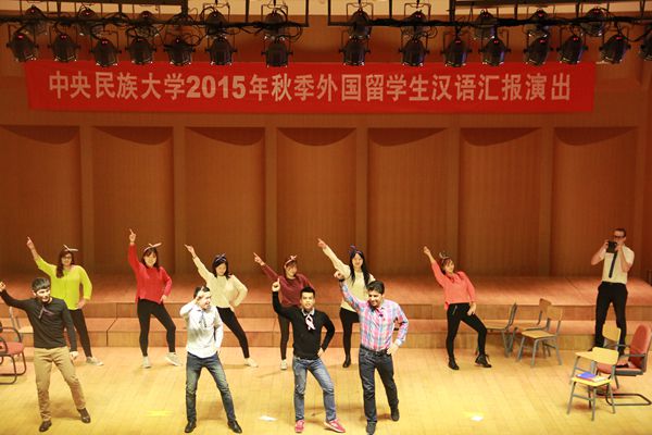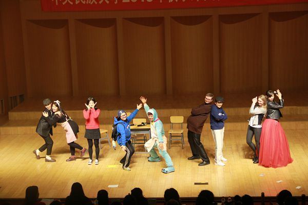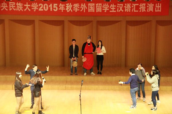 中央民族大学2015年秋季外国留学生汉语汇报演出于11月26日下午两点在中慧楼音乐厅隆重上演,校领导宋敏副校长、五院共建单位领导藏学院书记包永贵、民族学与社会学学院书记刘明新、william威廉中文官网副院长刘玉屏、副书记、副院长李锷与30多个国家的200多名外国留学生欢聚一堂,迎接这一年一度的盛典。演出由william威廉中文官网12个班的百名留学生倾情演绎,其中低年级组《新白雪公主》、中年级组《扑克背后的秘密》、高年级级组《哆啦A梦》分获组内特等奖。