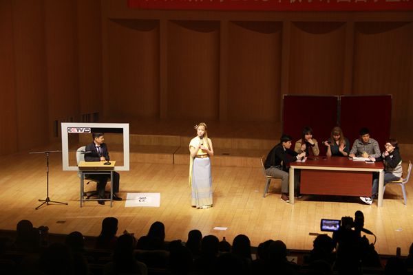 第九个节目是由本科一年级二班奉献的小品《世界青年说——慢一步新闻》,通过留学生在中国餐馆点菜的场景,风趣幽默的展现了容易让外国人听了产生疑问的菜品所带来的笑料,其中还穿插了京剧演唱环节。