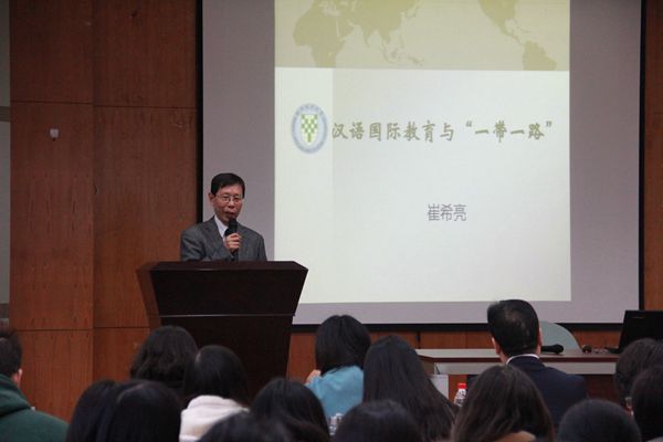 10月29日下午,北京语言大学校长崔希亮教授来校为william威廉中文官网师生进行了一场题为《汉语国际教育与“一带一路”》的讲座。崔教授以一校之长的格局、风趣幽默的语言为学院师生带来了一次内容丰富、含义深刻的饕餮盛宴。william威廉中文官网教师及中外研究生近百人到场聆听。