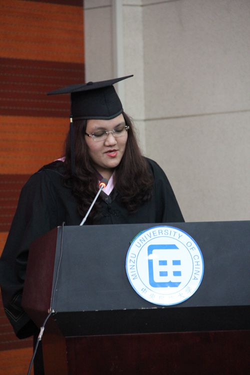 四位学生代表也分别发表了毕业感言。本科毕业生代表,来自印度尼西亚的何友丽与大家分享了大学四年里的青春回忆,对于母校的感恩,她说:“民大是我们生命中的一站,但绝不是生命中的过客。”说到感恩父母,她用一段母语对现场的父母表达感恩之心,哽咽的声音和饱含泪水的双眼,让大家颇为感动。她还献唱了一首自己改编的《没那么简单》,传递了离别的难舍之情,动人的歌声赢得在场所有人的掌声。获得北京市优秀毕业生荣誉的中国硕士毕业生代表彭赟用抑扬顿挫的演讲感谢母校给予的教诲,表示“中文之声传遍美国,汉语之花开遍五洲”是大家共同的期盼。来自缅甸的外国硕士毕业生代表瞿玉蕾,以及来自泰国的博士毕业生代表黄德永也分别表达了对母校的感恩和对同学们的祝福。