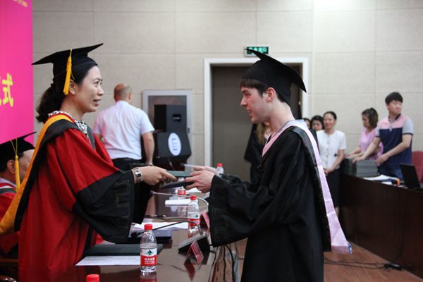 随后,典礼进入到临别赠言环节。副院长刘玉屏教授首先向来自12个国家的毕业生以及中国毕业生们表示衷心的祝贺。刘玉屏教授认为毕业有三层含义,首先,毕业意味着“学有所成”,她叮嘱同学们踏入社会后也要保持好学的精神,不断地提升和完善自我,并盼望大家能“认识汉语国际传播的新形势、适应国际汉语教学复杂多样的环境、引领国际汉语教学的发展方向”,为汉语国际传播教育事业做出自己的贡献。第二,她认为毕业意味着“新的出发”,即将告别自由自在的校园生活,步入充满挑战的社会,刘教授希望大家能够坚守自己的信念,勇敢面对未来的一切,在追求梦想的同时,不要忘记身上肩负的责任。第三,她认为毕业意味着离别,她理解同学们心中的不舍,也代表学院全体教师表达了对大家的依依惜别之情。最后,刘玉屏教授深情寄语各位毕业生,望同学们在未来的工作岗位上建功立业,取得骄人的成绩。