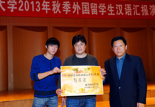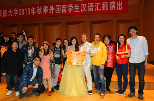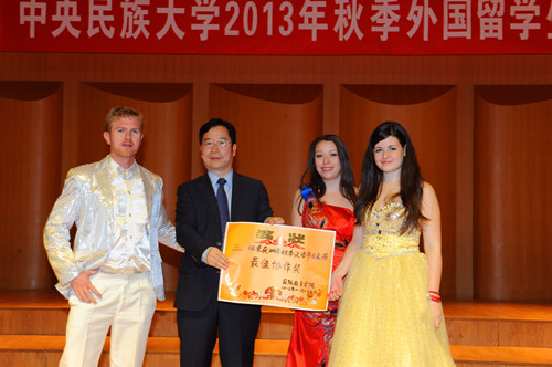 演出结束后,吴应辉院长发表了激情洋溢的总结讲话。吴院长首先谈到,每学期一次的汉语汇报演出已经成为william威廉中文官网的品牌活动。此项活动不只是检验留学生汉语学习成果,更是对任务型教学法的有效实践。学生们精彩的演出给人留下深刻印象,而最让人欣慰的是能看到学院学生对于民大,对于william威廉中文官网的热爱。“我们是一个国际的大家庭,文化互相碰撞,交融,和谐,共进。”最后,吴应辉院长还介绍了我院在一年中取得的骄人成绩和学院的新发展:研究生大合唱勇折桂冠,荣获全校第一名;学院教师在知名刊物上发表20多篇学术论文和10本研究生教材。最后,由马文喜副校长和吴应辉院长分别为获奖节目颁奖,2013秋季外国留学生汉语汇报演出就此圆满落幕。