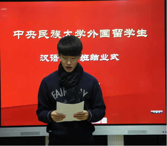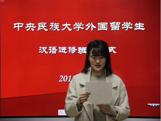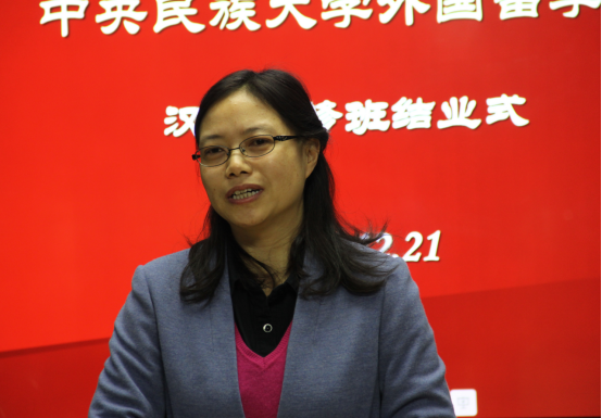首先由学生代表发言,来自日本的学生真砂玲奈表示虽然在中央民族大学留学的时间短暂,但这段留学生活带给她许多美好而难忘的回忆。她忘不了和同学们一起排练准备汉语汇报演出的日子。她还结交了少数民族的朋友,与她们的接触,开阔了她的视野,每个民族都有自己的文化习俗和语言,而且外貌也不一样,她意识到中国文化的多样性,认为在中央民族大学留学是一个非常明智的选择。