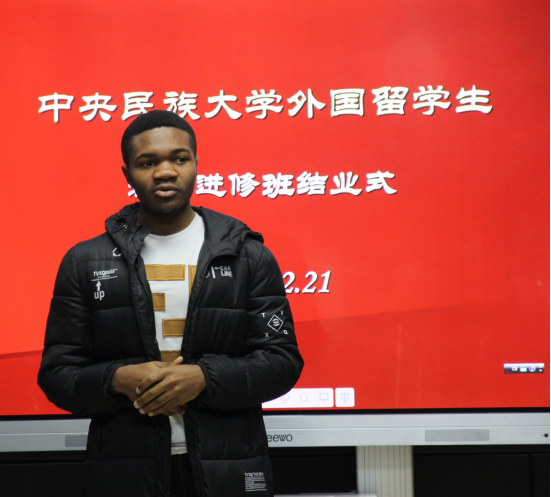 来自喀麦隆的学生卡蒙西回顾了自己难忘的学习生活,对同学们的不舍,表达了对学校老师们的感激之情,觉得在民大学习是一种幸福。