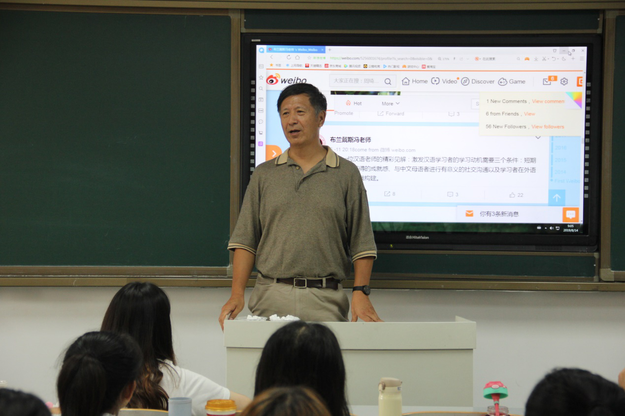 8月20日,冯禹教授做了题为“商务汉语:发展与挑战”的讲座。讲座讲了从哈佛大学的高级商务汉语到布兰戴斯大学的高级商务汉语的发展过程,提出了商务汉语对对外汉语教师的挑战,并介绍了任务型教学法。冯禹教授的课堂激情澎湃、妙语连珠,不时赢得同学们的热烈掌声。讲座现场气氛热烈,欢声笑语一片,同学们与老师的互动也异常活跃。