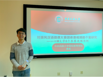 谭斌同学报告的题目是《对汉语微课大赛视频的个案研究》,谭斌同学的汇报从教学内容、教学设计、视觉传达三个方面对汉语微课进行了全面的分析,层次清晰,语言流畅,论点较为新颖,受到了与会者的一致好评。田艳副教授受邀担任此次会议分会场的召集人及点评嘉宾。我院2019级汉语国际教育硕士研究生徐小童同学也接到了大会组委会的参会及宣读论文的邀请。