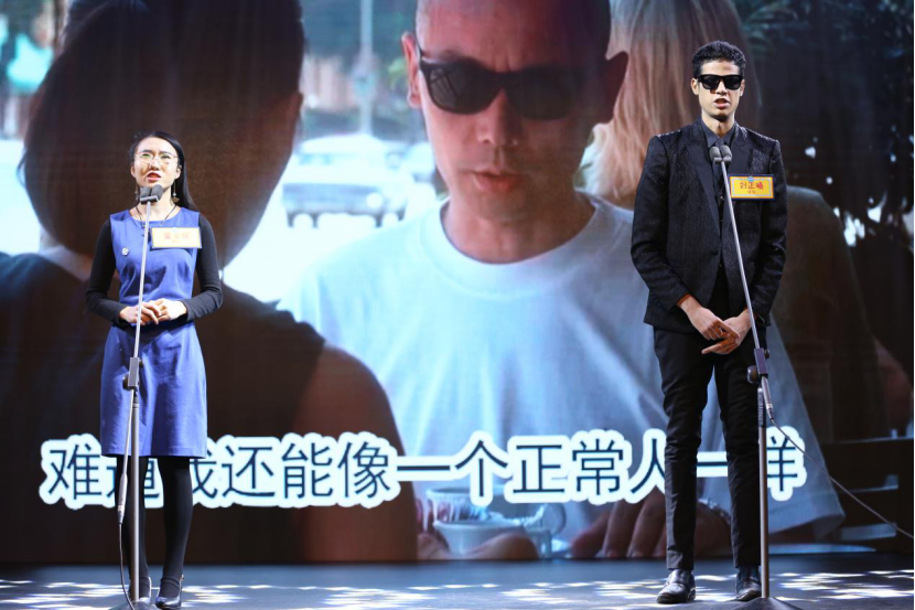 下午两点半,比赛正式开始。第一轮比赛由主办方选定配音视频,十四名参赛选手两两组队共同完成配音。瞿玉民同学在第一轮为电影《不见不散》中徐帆扮演的角色——李清配音,准确的发音吐字和精准到位人物情感把握获得了三位评委老师高度认可,最终以2:1的比分顺利晋级。