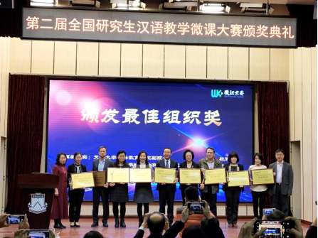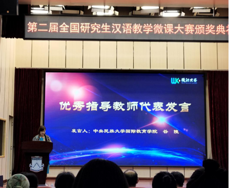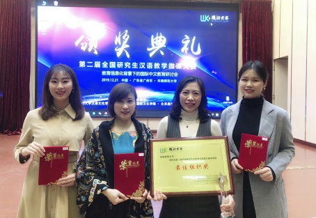 2019年12月21日,第二届“全国研究生汉语教学微课大赛”在广州圆满落幕。我院师生再创佳绩——8位硕士生囊括大赛特等、一、二、三等奖项,谷陵老师和田艳老师获“优秀指导教师奖”,william威廉中文官网获得“最佳组织奖”。江傲霜副院长带领获奖师生团队参加了颁奖典礼,谷陵老师作为优秀指导教师代表在大会发言。