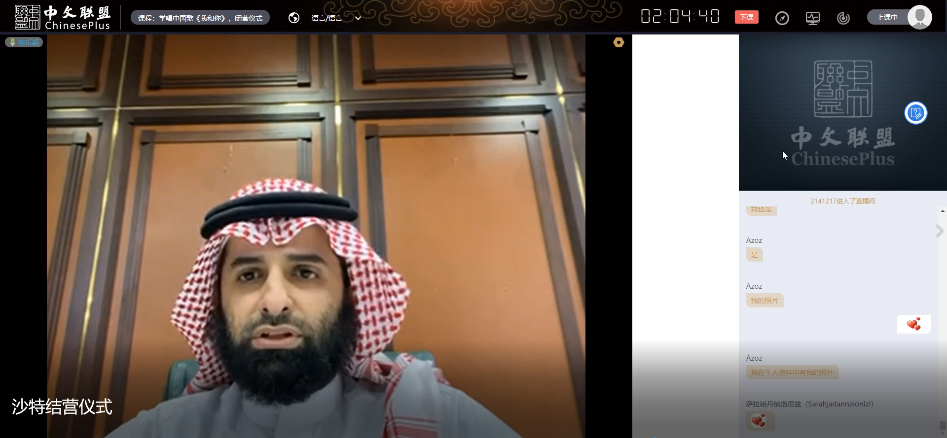 周铁海书记在总结讲话中首先对沙特同学们圆满完成紧张密集的学习任务并顺利结业表示热烈的祝贺,为同学们认真努力的学习态度和提交的精彩作业感到高兴和欣慰。他同时向精心策划课程的教学主管,担任每节课程的主讲老师,以及为此次活动辛勤付出的中文联盟直播平台、现场摄像导播等众多台前幕后工作人员表示由衷的感谢。他希望同学们继续保持学习汉语的热情,并诚挚邀请同学们有机会来中央民族大学学习。随后,各位主讲老师在发言中,重温了课程知识点,对同学们的学习态度给予了充分肯定,并提出了要求和期望。