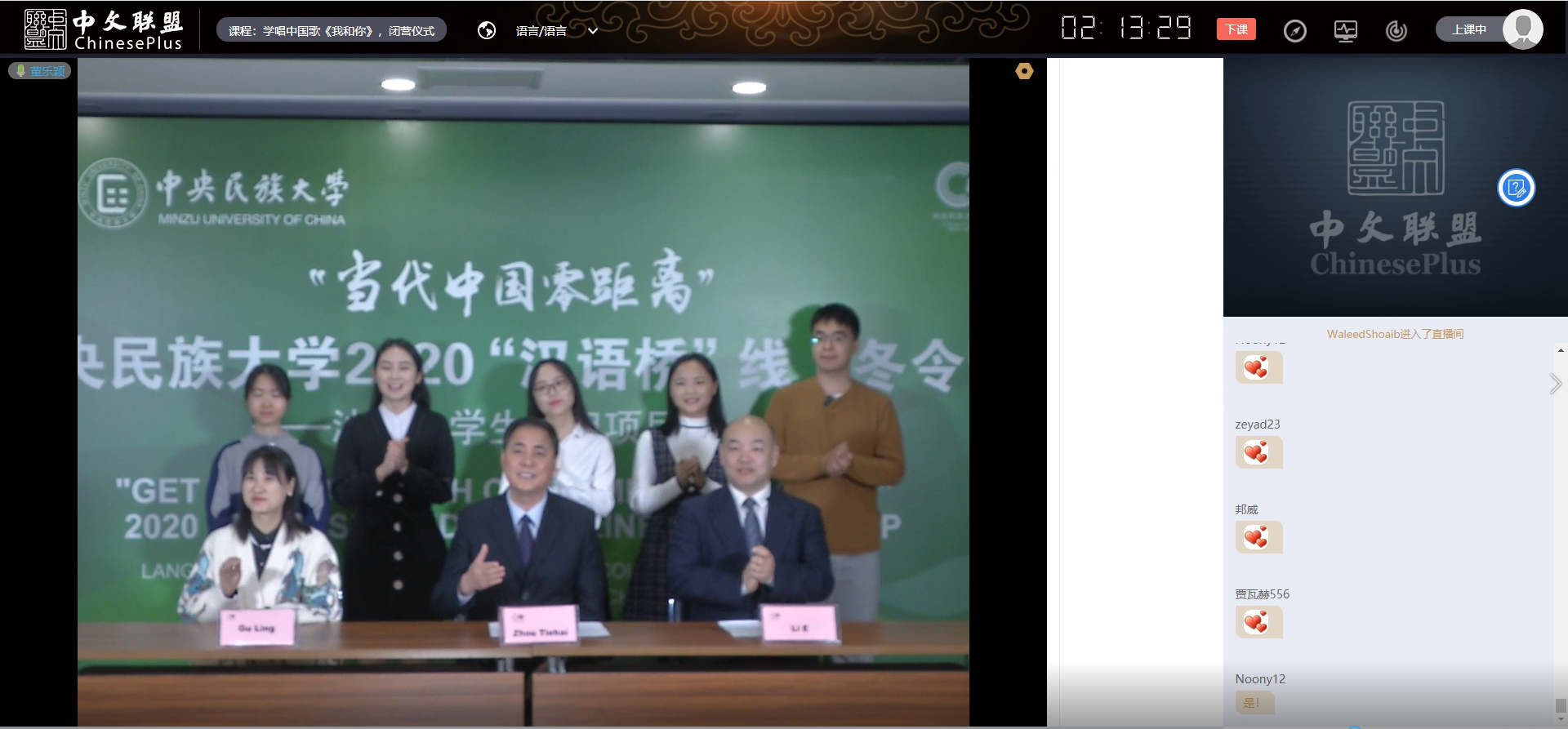 闭营仪式最后,周铁海书记带领全体主讲教师和同学们一起再次唱响了《我和你》。“我和你心连心共住地球村。为梦想千里行相会在北京。来吧朋友伸出你的手,我和你心连心,永远一家人……”在悦耳的歌声中,老师们通过屏幕和学员们挥手作别。为期一周的中央民族大学2020“汉语桥”线上冬令营沙特大学生团组项目圆满结束。