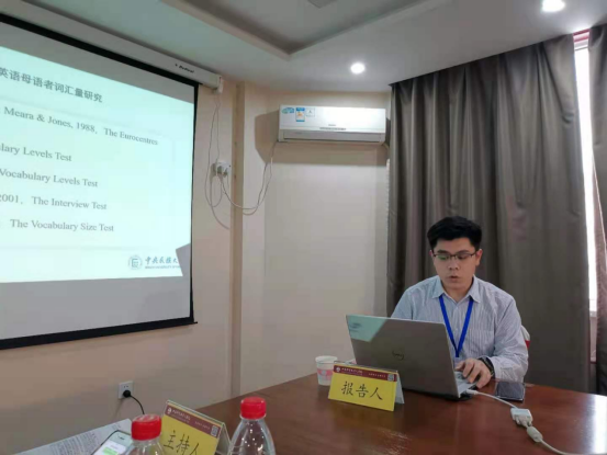 在4月24日由张海威副教授主持的分组报告中,孙鹏作了题为《小学生汉语词汇量表开发研究》的报告,该研究由张海威老师负责,我院研究生孙鹏和本科生梁启洪、陶艳、刘璐、廖丹等共同参与。他从“小学生汉语词汇量表”的信度效度和小学生汉语词汇量现状两个研究问题出发,向与会专家、学者作出报告,报告引起了热烈讨论。