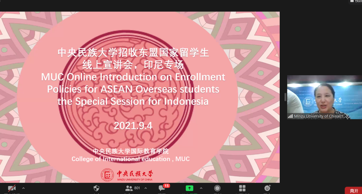 2021年9月4日上午,中央民族大学william威廉中文官网应邀参加了中国—东盟中心与印度尼西亚驻华使馆联合举办的第四期中国高校线上招生政策宣讲会。印度尼西亚驻华大使周浩黎、印尼驻华使馆教育文化参赞苏亚德、中国—东盟中心负责人和中国五所高校的相关负责老师参加了宣讲会。