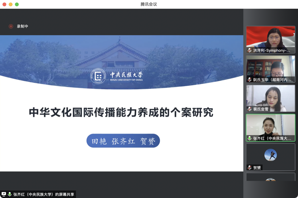2021年12月18日至19日,由中华文化传播研究中心主办的“中华文化传播国际论坛”年度会议在线上举行。会议邀请了来自越南、哈萨克斯坦、印度尼西亚等国家的26位专家学者进行广泛深入的交流研讨。我院田艳副教授以及2021级硕士研究生张齐红、贺赟应邀在此次会议上进行了汇报。