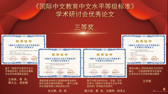 我院2021级硕士研究生魏少丽、黄旭、杨寻止、王暄婷作为一个团队在罗莲老师的指导下分别做了学术报告。她们的报告从内容分析的角度,分别依据HSK(五级)写作、阅读、听力和HSKK(中级)口语的数据,从多个维度对现有的HSK(五级)以及HSKK(中级)口语的试题任务和考生产出进行了分析,探讨与《等级标准》的对应情况,回答了HSK能否与《等级标准》对应以及预估对应等级的问题,并提出了相关建议。其中,该团队的论文“基于内容分析对HSK(五级)写作任务与《等级标准》的等级对应研究”向研讨会投稿并参加优秀论文评选,荣获了《国际中文教育中文水平等级标准》学术研讨会优秀论文三等奖,这一成绩对于一年级新生来说是很难得的。