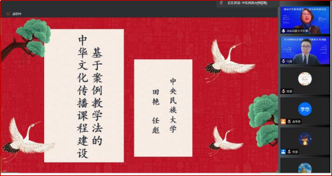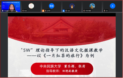 本次会议共开设了教学法创新与实践及教育技术发展等八个专题论坛,田艳副教授受邀主持“文化教学与教学法创新”专题。我院2018级硕士研究生任彪报告了和导师合作完成的论文《基于案例教学法的中华文化传播课程建设》。2020级硕士研究生董乐颖和张清进行了题为《5W理论指导下的汉语文化微课教学——以<一片红茶的旅行为例>》的学术汇报,探讨了汉语文化微课教学的设计框架和实施策略。他们的报告引起了参会学者的关注和提问。大家在会议讨论区就“文化微课教学”和“文化课程建设”展开了热烈讨论。