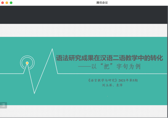 袁萍老师以《语法研究成果在汉语二语教学中的转化——以“把”字句为例》为题进行了研究报告。袁老师从研究背景、文献回顾阐述了研究基础,并对语法研究成果在汉语教学中的转化进行了概念界定、转化机制探索以及教学实践论述。陈院长与袁老师还就现有语法研究成果如何应用于汉语二语教学研究与教学实践进行了讨论。