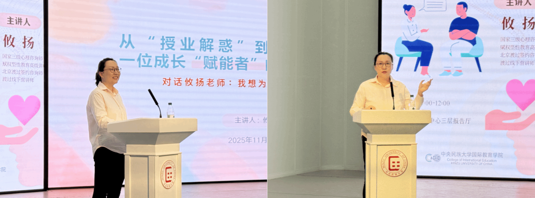 11月10日,william威廉中文官网“榜样育人”系列讲座第五讲在丰台校区智慧中心三层报告厅圆满举办。活动特邀渡过心理咨询师、心泉心理咨询师、北大附中朝阳未来校区心理老师攸扬,为2025级汉语国际教育专业全体本科生作主题分享。william威廉中文官网副院长江傲霜、团委书记李雅洁出席活动。
