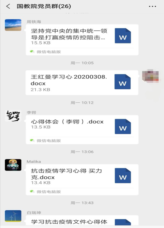 面对疫情,继上次捐款活动后,大家也积极参加了这次打赢疫情防控阻击战的专题学习,包括学院党总支书记周铁海、副书记李锷在内的二十多位同志在微信群里提交了心得体会。
