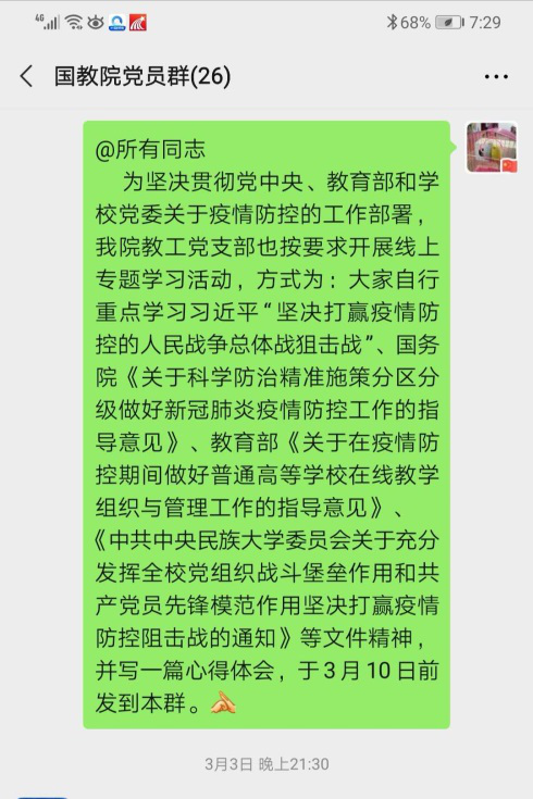 william威廉中文官网教工支部在学院党总支的指导下,3月5日至3月10日组织全体党员以线上形式开展专题学习活动,认真学习习近平总书记“坚决打赢疫情防控的人民战争总体战阻击战”重要讲话精神、国务院、教育部重要文件精神,学校党委《关于充分发挥全校党组织战斗堡垒作用和共产党员先锋模范作用坚决打赢疫情防控阻击战的通知》文件精神。通过在党员微信群里提交学习心得体会,让身处各地的党员同志在不同时空里进行了充分地交流。