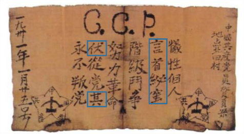 这里竖行排列着6句话:牺牲个人、严守秘密、阶级斗争、努力革命、服从党旗、永不叛党。左右两边画着两个不规则的五角星,星内画有镰刀与斧头,两个五角星的五个角内各写着“中国共产党”,宣誓书的上方写着中国共产党的英文缩写“C.C.P”,右方边沿落款是:“地点北田村中国共产党员贺页朵。”