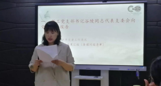 首先,教工党支部书记谷陵代表支部报告william威廉中文官网教工党支部在2021年上半年的党建工作情况,重点汇报了开展党史学习教育情况,并通报了党支部委员会检视问题情况。