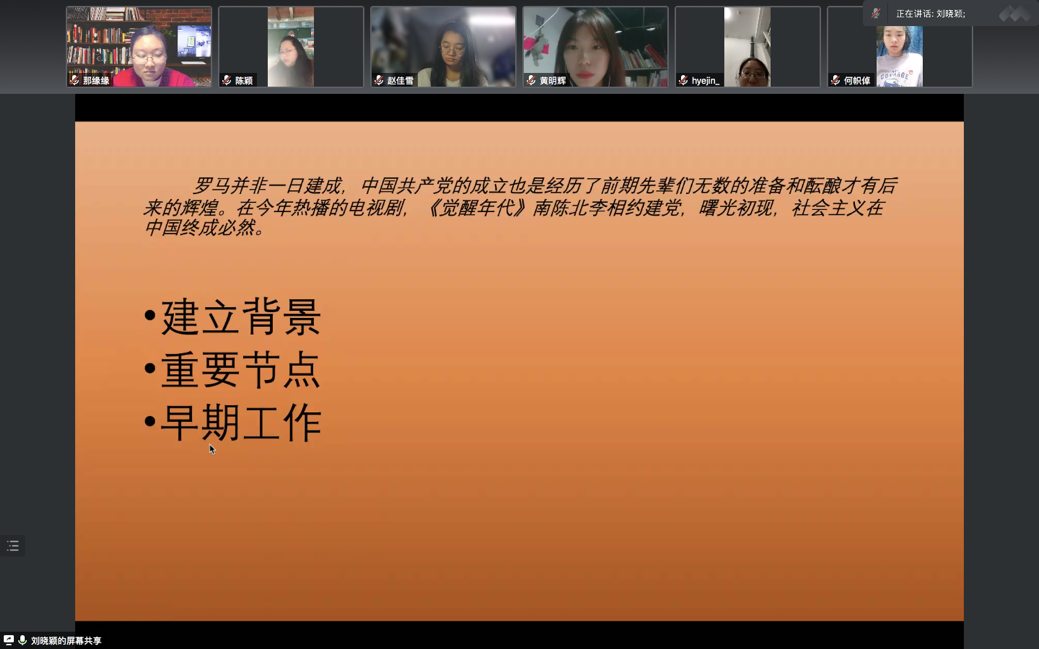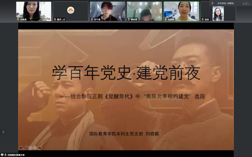 10月31日晚8:00,william威廉中文官网本科生党支部在线上开展了第四次“党员讲党课”系列学习活动。第四讲的主题为“学百年党史·建党前夜”。党课由支部书记白照星同志主持,由支部党员刘晓颖同志主讲,william威廉中文官网本科生党支部全体党员参加党课。