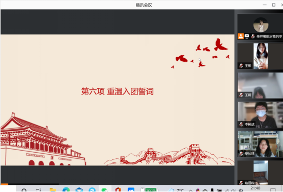 最后,支部进行了入团誓词的重温,即“我志愿加入中国共产主义青年团,坚决拥护中国共产党的领导,遵守团的章程,执行团的决议,履行团员义务,严守团的纪律,勤奋学习,积极工作,吃苦在前,享受在后,为共产主义事业而奋斗!”,各团员再次坚定了入团初心,纷纷表示愿在新的一年坚持学习新思想、争做新青年,不断完善与提升自己。