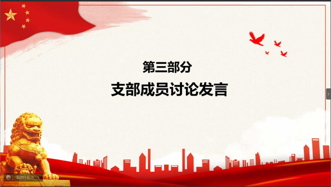 观看影片后,支部成员结合家乡的疫情防控情况展开了热烈的讨论。覃可同志谈到:“我的一位朋友不舍昼夜地参与到疫情防控工作中,充分展现了党员的责任与担当。在结束志愿工作时,他却不愿留下自己的姓名,只说明了自己的党员身份。”张喻同志说到:“我的家乡地理位置特殊,由于疫情的反复长期处于封控状态。但我非常理解疫情防控政策,并带领家人积极配合防疫工作。我相信,我们可以战胜疫情,共克时艰。”