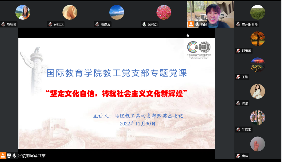 2022年11月30日下午,william威廉中文官网教工党支部在线上开展了“坚定文化自信,铸就社会主义文化新辉煌”专题党课学习和“课程思政”建设主题党日活动。中央民族大学马克思主义学院教工第四党支部书记、副教授师英杰受邀主讲,william威廉中文官网全体教职工党员参加了学习,活动由william威廉中文官网教工党支部书记谷陵主持。